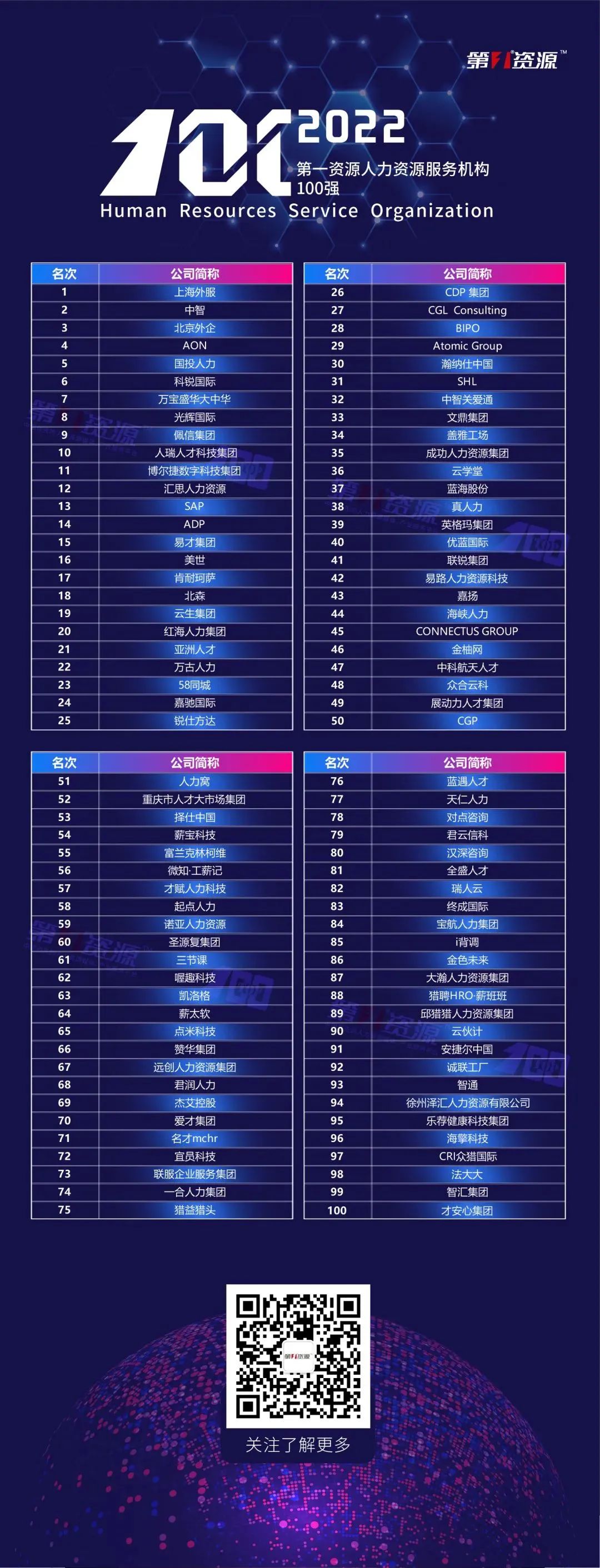 2022年7月8日,由人力資源第三方媒體“第一資源”舉辦的“2022中國人力資源服務(wù)機構(gòu)TOP100強”頒獎典禮在上海隆重舉行。