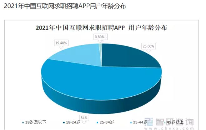 據(jù)相關(guān)數(shù)據(jù)顯示,從2021年中國互聯(lián)網(wǎng)求職招聘APP用戶年齡分布來看,25-34歲的年齡階段群體占比超50%,達(dá)到54%;其次,18-24歲的占25.6%;35-44歲的占19.4%;45歲以上的占0.8%,18歲以下的占0.2%,當(dāng)然,這僅僅是2021年的數(shù)據(jù)。相信在2022年,這個(gè)數(shù)據(jù)更是呈現(xiàn)年輕化趨勢。